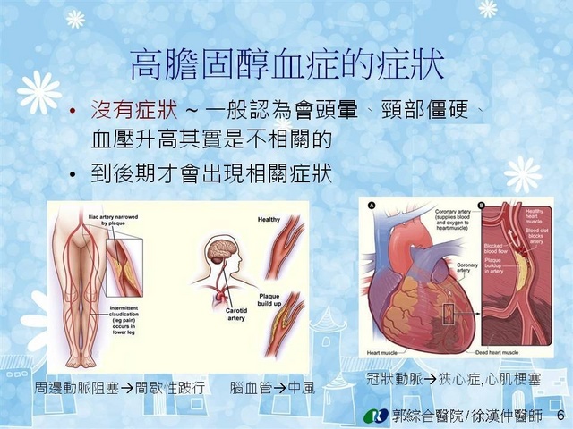 13/01/2013 1 高血脂 • 大多與飲食有關,極少數病例是遺傳基因所致 膽固醇值太高,特別是ldl(壞的膽固醇),容易 滲入血管壁中,形成動脈粥狀硬化。 •